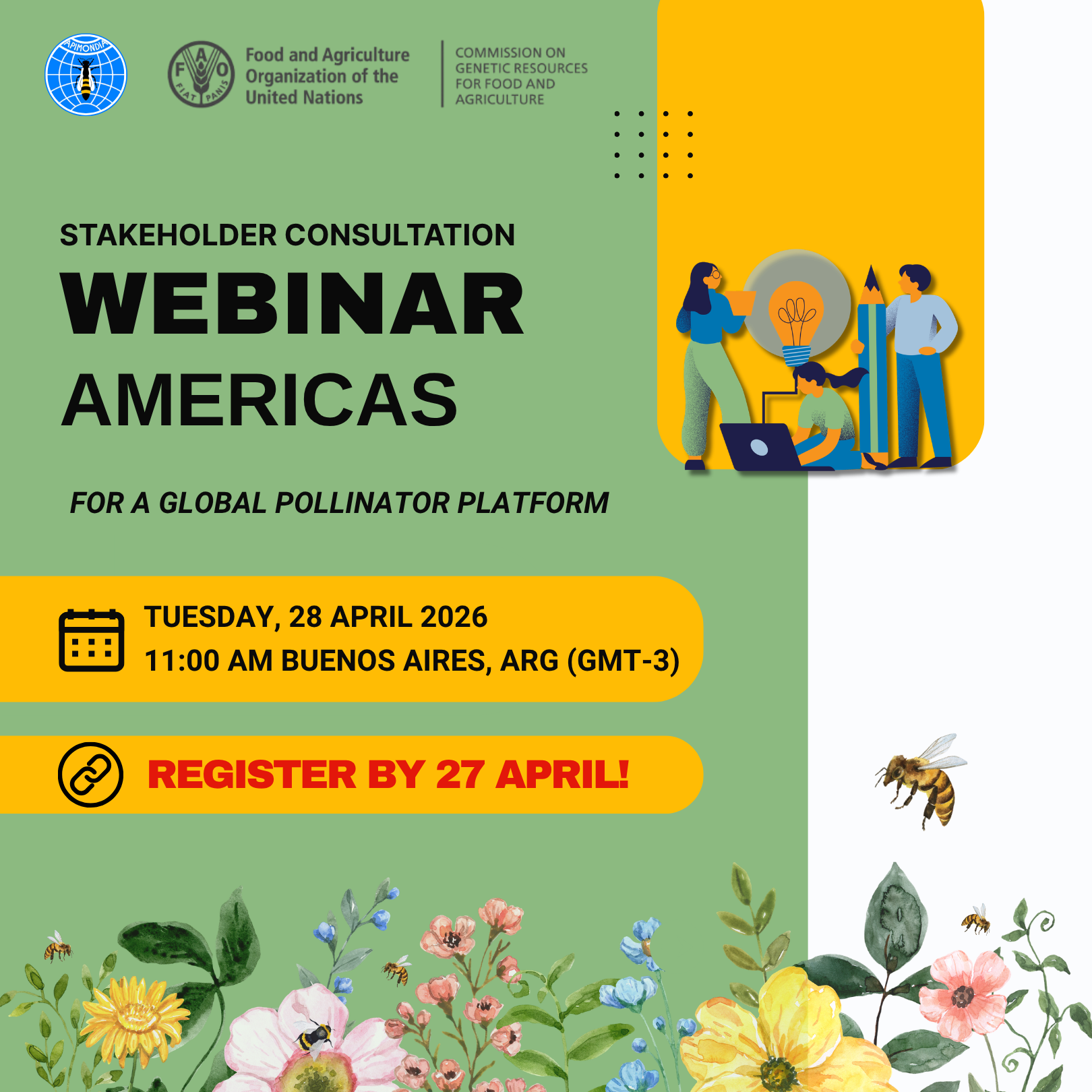 A raíz del anuncio publicado la semana pasada en el sitio web y las redes sociales de Apimondia, nos gustaría informarles de la consulta en línea sobre la creación de una Plataforma Mundial de Polinizadores que Apimondia está organizando en colaboración con la FAO el martes 28 de abril de 2026 a las 11:00 horas, hora de Buenos Aires.